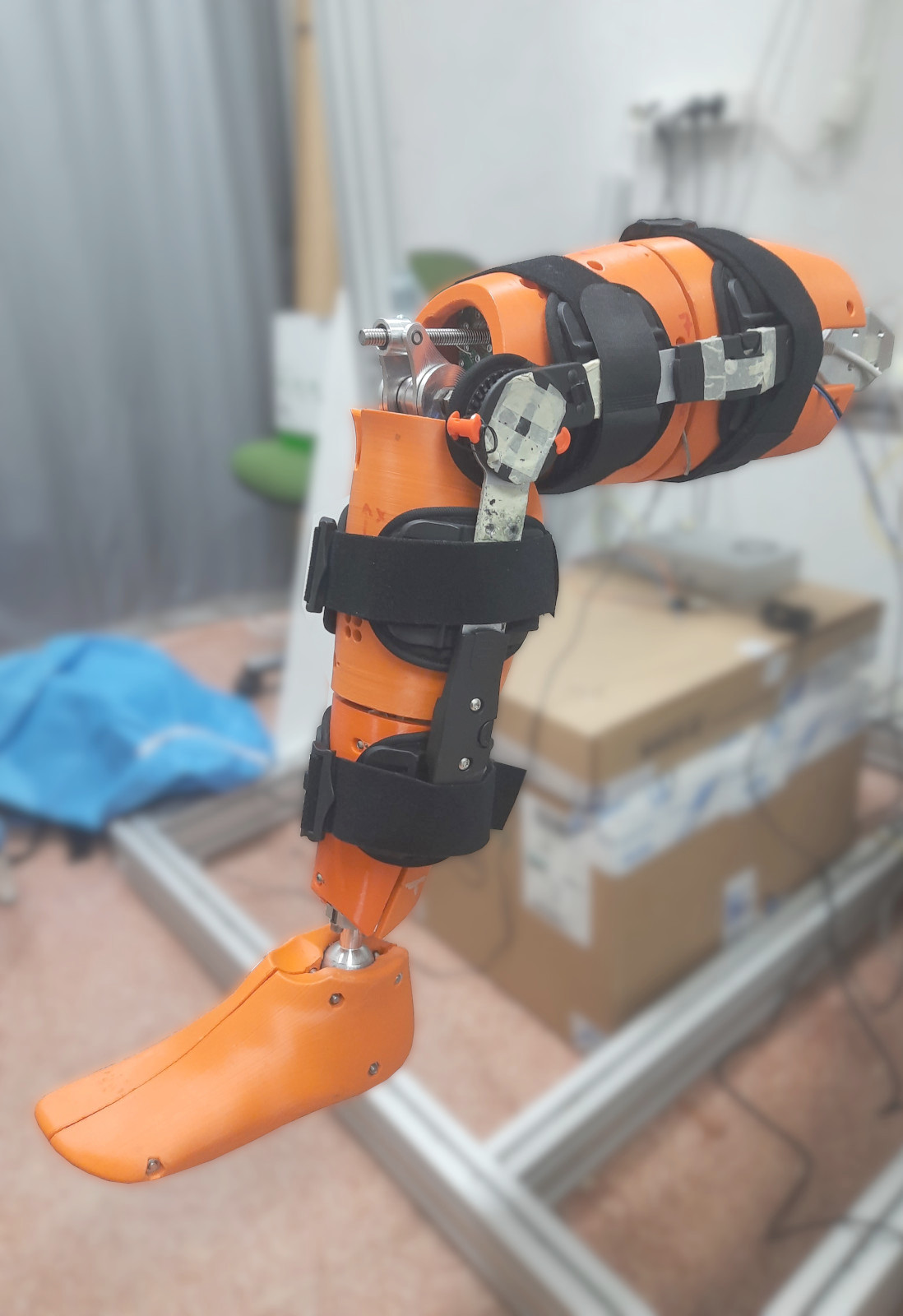 The leg replica was used to evaluate the passive knee orthosis and mounted on a stand.